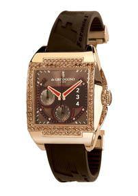 曲线形抛光玫瑰金和无光黑色黄金表壳配自动计时码表机芯。弧形玫瑰金表圈镶180颗棕色钻石(3.83克拉),螺丝拧紧的玫瑰金下层表壳,表冠雕有de Grisogono 顶饰,2点和4点一体式按钮,带两个计数器的双层计时码表表盘,底层为深棕色缎面处理,6个玫瑰金螺钉给棕色的方向盘增色,玫瑰金小时和分钟指标中心涂成红色,计数器和黑色带红色末梢大号秒针。带抛光玫瑰金折扣的棕色橡胶表带,防水30米。