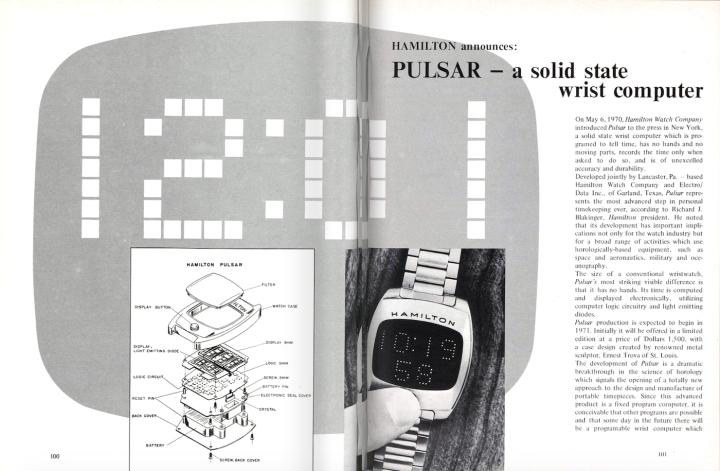 “今天,如果你在搜索引擎中输入“智能手表的历史”,第一个出现的名字就会是汉米尔顿脉冲星,它是历史上第一款智能电子手表。”