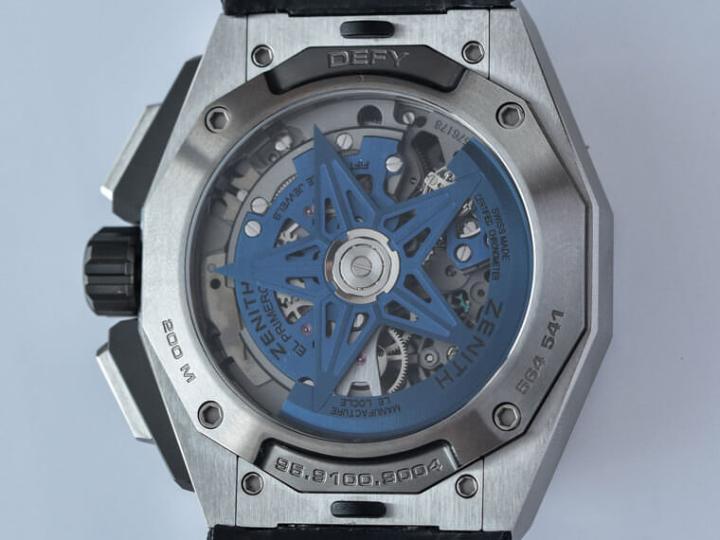 DEFY Extreme搭载的El Primero 9004机芯其实跟DEFY El Primero 21是同一枚,前述提到它具有两组擒纵系统,而它们的动力补充方式也很特别——走时轮系的擒纵系统震频为El Primero机芯招牌的36000转,能借由机芯的自动盘补充动能,当需要手动帮走时轮系上链时,要把表冠往逆时针方向转动;反之若将表冠顺时针转动则是帮计时轮系补充动能(计时轮系动能只能靠手上链补充)。透过透明底盖可以窥见El Primero 9004机芯超有特色的五角星自动盘,双色钛金属款的机芯部分零件包括自动盘都是镀成蓝色,看起来有别于传统机芯的严肃感,且手表的两组擒纵系统运作时也能在此一览无遗,看得人啧啧称奇。最后不得不提DEFY Extreme还融入时下流行的表带快拆系统,而且真力时还很有诚意地一次给齐钛金属链带、橡胶表带和系列首见的Velcro®魔鬼毡表带,佩戴者可以轻松更换表带,让手表瞬间散发适合不同场合的风格。