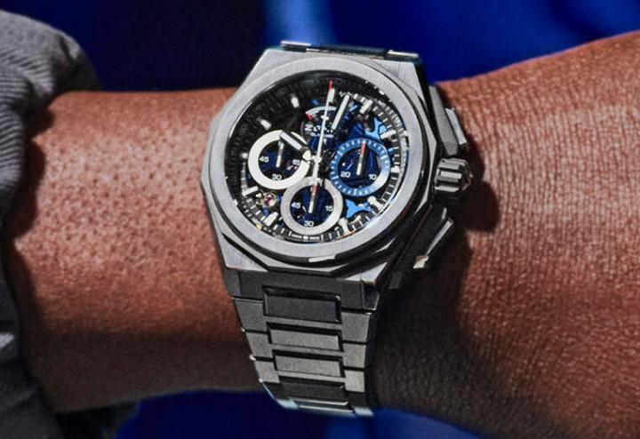真力时这次从1960年代第一DEFY手表(型号为A3642)取经,包括多切面的表壳以及多边形表圈都是受到半世纪以前的A3642古董表所启发,除了本款缎面拉丝抛光和雾面处理的钛金属表壳版本外,品牌也一并发表黑色喷砂钛金属以及黑色喷砂钛金属与玫瑰金的半金组合款式。其中这款外观没有特别黑化处理的钛金属款,其面盘的开面设计露出局部镀成蓝色的机芯零件与机芯多数呈灰色调的零件形成双色对比感,同时这款的小表盘外围刻度环也蕴含向El Primero A386三色小表盘致敬的概念——其他两款黑色喷砂钛金属款以及半金款小表盘刻度环均为统一的黑色调,这使得这款双色钛金属款的面盘特别具有色彩的变化性。