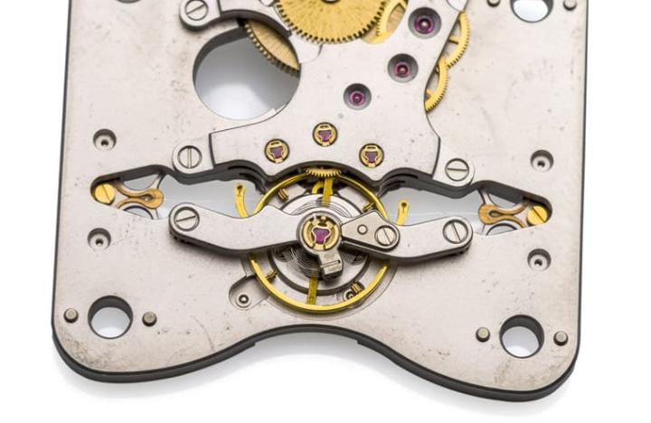 这枚外观接近矩形的概念机芯是劳力士1998年所制作的,据说当时共打造了20枚,可见现存的数量已经不多,光是机芯外型独特这点还不够,ELF 7230机芯的设计本身也很有意思,从图中可见机芯背面约莫在摆轮正后方的位置出现一个类似椭圆形的装置,这其实是劳力士用来提升机芯精准度的恒定动力装置,从机芯背面可以见到恒动动力装置中间有一条细线横亘,另外这装置的上半部可见两枚Kif避震器、下半部也还有另一枚Kif避震器,前面两个主要是作为擒纵轮的避震之用、后面那个则是负责摆轮轴心的避震功效。