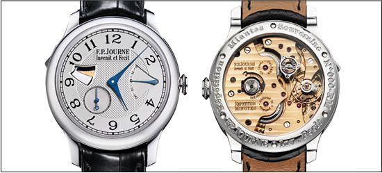 让我们来比对一下展览会上两家似乎路线截然不同的制表商(他们均品质不凡)来明确这一情况吧。在我左边的古款是François-Paul Journe的Répétition Minutes Souveraine。在我右边的今款宛如不明飞行物般,是DeWitt的WX-1。哪款更具革命性呢?