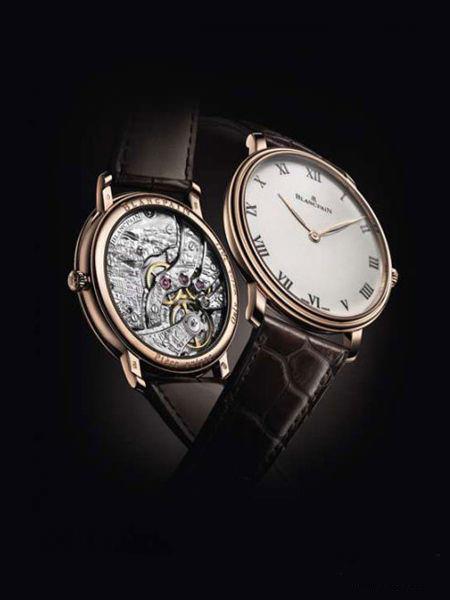 Blancpain 宝珀的 Villeret 系列腕表曾获颁最佳超薄表奖,表面上没有一分多余的细节和装饰,罕有地将朴实无华、简洁有力的美感发挥得淋漓尽致。宝珀这款于2011巴塞尔表展上推出的Villeret GRANDE Dé CORATION繁复纹饰腕表因其内外反差强烈而极具识别度。表盘秉承宝珀的经典传统样式,配以珐琅刻度,简练至极,而透过表后盖呈现出来的却是纹饰繁复的机芯。腕表表径45mm,表盘为半穹形大明火烧制珐琅,绘以罗马数字的12小时刻度。搭配18K玫瑰金打造的表壳,使腕表显得异常传统。但透过蓝宝石玻璃底盖,则可以欣赏到这款腕表的惊人之处。腕表搭载了Calibre15B超薄手动上链机芯,由117个部件组成。因为机芯夹板较厚,使得宝珀雕刻大师们可以在机芯夹板上尽情挥洒他们的艺术天分。今年巴塞尔表展期间,这枚腕表推出了五款,其机芯夹板分别展示了了瑞士、法国,日本,中国大陆和中国香港五个不同地区标志性风貌。