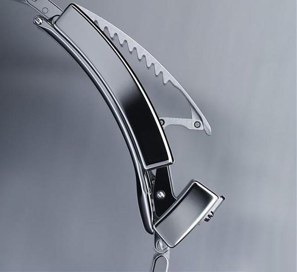 折迭安全扣一般较常出现在运动手表中,虽然使用起来跟弹簧扣折迭扣非常相似,但是却增加了安全扣这个保护系统,目的是为了预防像潜水表潜入深海后不会因误触发生状况,让手表能安全的佩戴在手腕上。 对于折迭安全扣的设计,劳力士就发明了Glidelock带扣,双延展系统表带,由抗侵蚀性高的904L不锈钢打造,专为深海环境而设计。 劳力士专利Glidelock带扣让潜水员可以每小节2mm的长度,将表带延长至20mm,而折扣伸缩链节更可使表带额外再延长26mm。