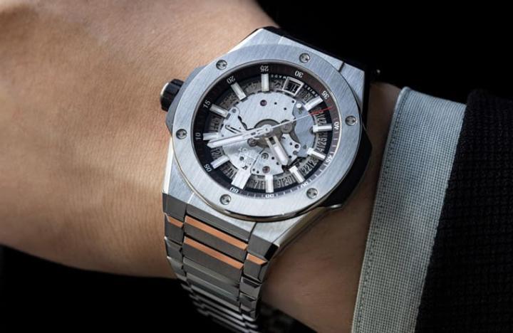 原本采用炼带的大爆炸手表是以计时功能为主、偶尔有几款陀飞轮,到了2022年宇舶又再增加采用炼带设计的40mm三针手表提供市场更丰富的选择。表壳及表圈与Big Bang Integral系列具有相同特色,如表圈饰有6颗H型钛金属螺丝,强化这款手表的品牌辨识度,此外炼带也是由三枚炼节所构成,錬节都经过抛光与缎面处理,并采用倒角建构,赋予炼带和表壳及表耳互相呼应的质感。手表面盘延续计时码表般的开面设计,露出机芯的机械结构之余,仅显现时、分、秒与日期等基本时间资讯;手表的三针功能由HUB1710机芯驱动,其设计与作工散发宇舶的招牌风格,在透明底盖透视下让人能够一窥机芯的细致结构。