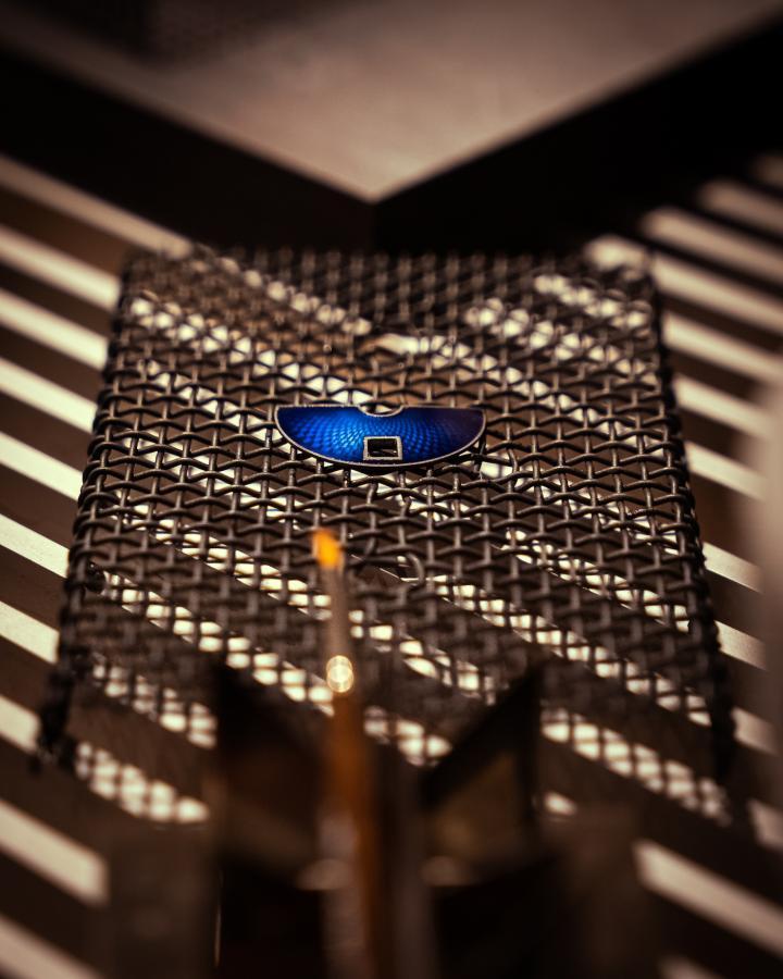 6点钟位置的透镜状秒针显示部分被瑞宝独家称为“UFO”,这一富有科幻色彩的名称充分反映了其中蕴含的高超技术和美学内涵:这是一块纯金制成的弧形三维表盘,饰有由瑞宝工匠手工完成的微尺度玑镂刻花,最后覆上半透明蓝色大明火珐琅饰面——与12点钟位置的新月完美呼应。