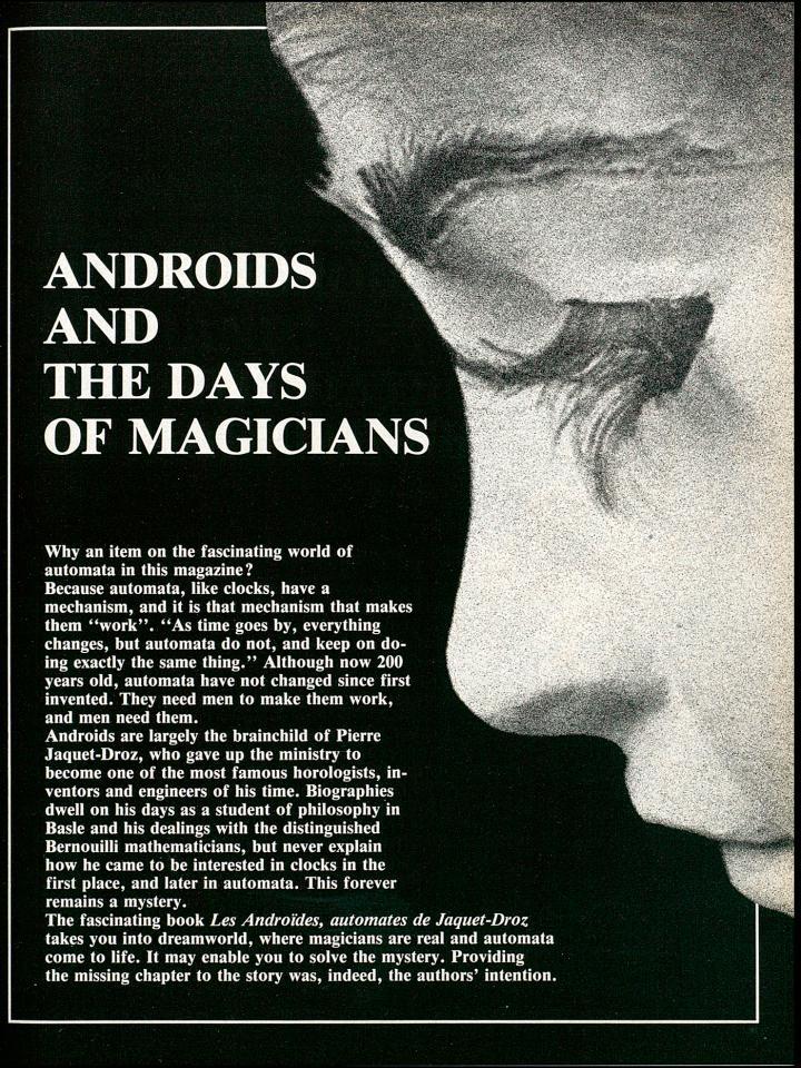自1773年起,Jaquet-Droz与Leschot不断精进并推出日益精密的自动玩偶。他们的巅峰之作是三尊仿生自动玩偶:它们分别是1774年于拉夏德芳(La Chaux-de-Fonds)展出的The Writer (作家)、The Draughtsman (画家) 与 The Musician (音乐家)。这三件艺术杰作令全世界的鉴赏家为之倾倒。
