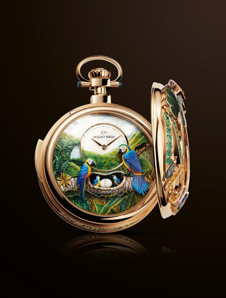 56毫米红金表壳,机芯配备三问报时装置,还有具备八种动态的自动玩偶—通过9点位置的装置启动:彼此配合,协同运作。当背景中的瀑布流动起来,整个动态场景栩栩如生:鹦鹉爸爸和妈妈移动起来,鹦鹉蛋孵出,小鹦鹉的脚也动来动去,颇具妙趣。由雅克德罗手工艺大师完全手工精制的这个场景展现了以下高水平工艺:微型画、雕刻和大明火珐琅。包括表盘侧和表背在内的整个表壳完全手工镶嵌和上彩,且在怀表挂环内隐藏的一个开口内配备一个私密装置 (已获得两项专利)。这一部分手工镶嵌了1240颗宝石,包括486颗绿宝石、727颗蓝宝石和16颗红宝石。