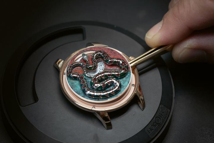 然而,真正的精妙之处远不止于此。蛇身柔韧灵动,整枚表盘皆由流畅曲线勾勒而成,其设计看似简约,实则蕴含着非凡的工艺难度。如此繁复的表面结构,以至于几乎没有可能进行珐琅工艺处理,因为预先烧制的珐琅呈粉末状,理论上无法固定于动物造型的整个圆形表面。然而,雅克德罗(Jaquet Droz)的制表大师们不仅攻克了这一难题,甚至处理得更加出色。他们不仅让珐琅完美贴合蛇身的每一处细微起伏,更以精湛技艺实现色彩的渐变过渡,从浅绿到深绿层层晕染,甚至在有些表款上还做到了以浓烈的血红色与之交相辉映。