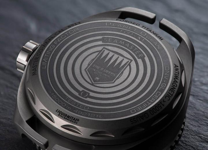 而对于腕表来说,如何将蓝宝石水晶玻璃装设于深海腕表是一大考验,为了均匀分散压力,欧米茄取材自潜水舱观察窗口的圆锥形乘载设计,就如Limiting Factor号采取的设计,且腕表还采用了Liquidmetal,此材质成为稳固而灵活结合蓝宝石与表壳的选择,此革新的热成型融合使腕表免于使用聚合物密封,从而减低蓝宝石的厚度。