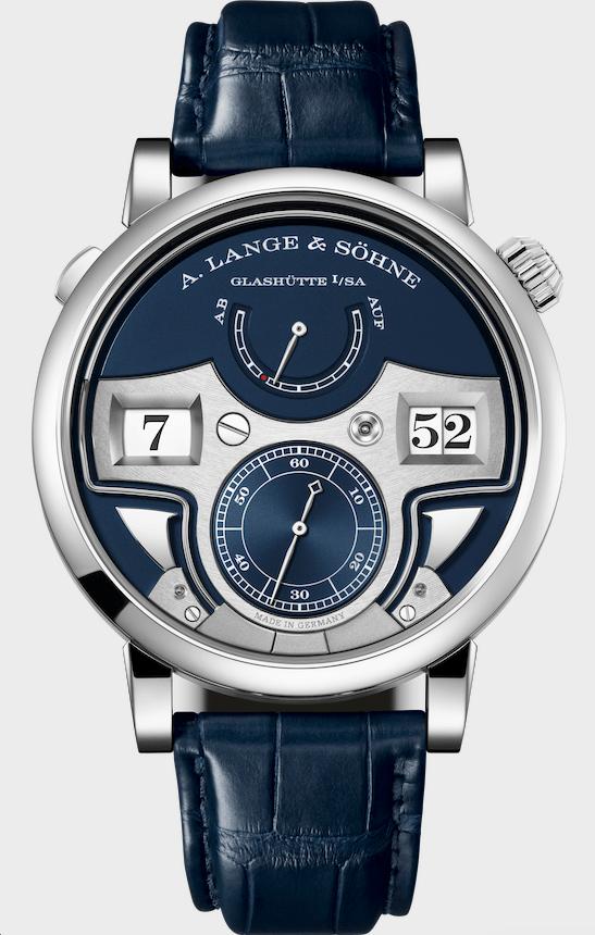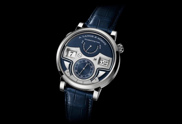 A. Lange & Söhne 朗格于2015年推出的Zeitwerk Minute Repeater,是世上唯一一款结合机械跳字显示和十进 制三问装置的腕表。这款表精密复杂,单是组装已需时数月,先前品牌只推出过铂金950款。在面世五年后, 朗格为这款作品推出配备深蓝色面盘的18K白金款式。