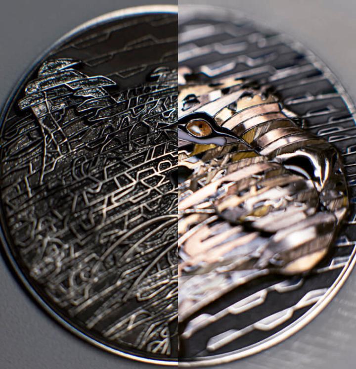 为了营造更生动的透视感和景深效果,工艺师必须运用其他领域的专业技艺,例如中景的竹林及美洲豹身上的豹纹和豹眼是镶刻弧形珐琅制成,另外面盘背景的夜空与草地则透过微绘技巧形成,透过珐琅和微绘工艺的加分,使得面盘中央的主角——镶嵌钻石的美洲豹金雕看起来不致过于单调,反而活灵活现让面盘的整体画面显得逸趣横生。