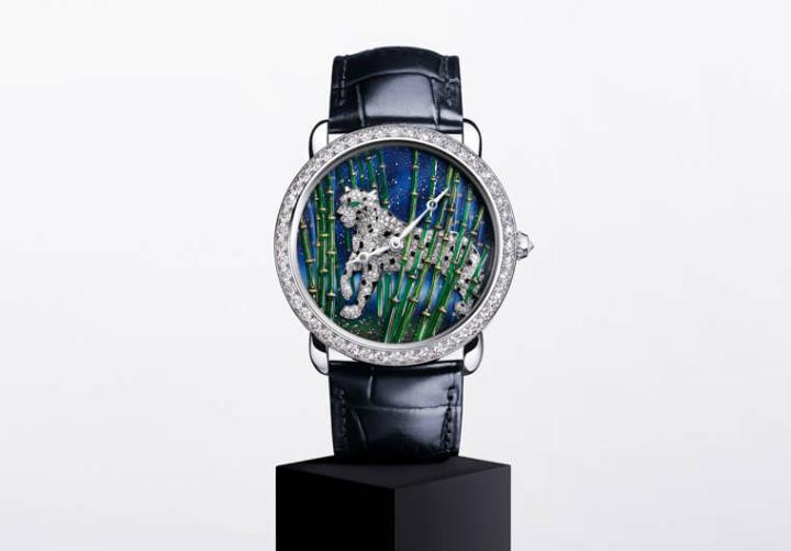 卡地亚在这款表上乃是将金银丝技艺套用在珐琅媒材上,品牌藉由这种技术先将珐琅粉加热,接着将其延展成竹子造型,然后再以纤细的黄金线段凝固在面盘上,由此形成最终成品上交迭在美洲豹装饰上的竹林。