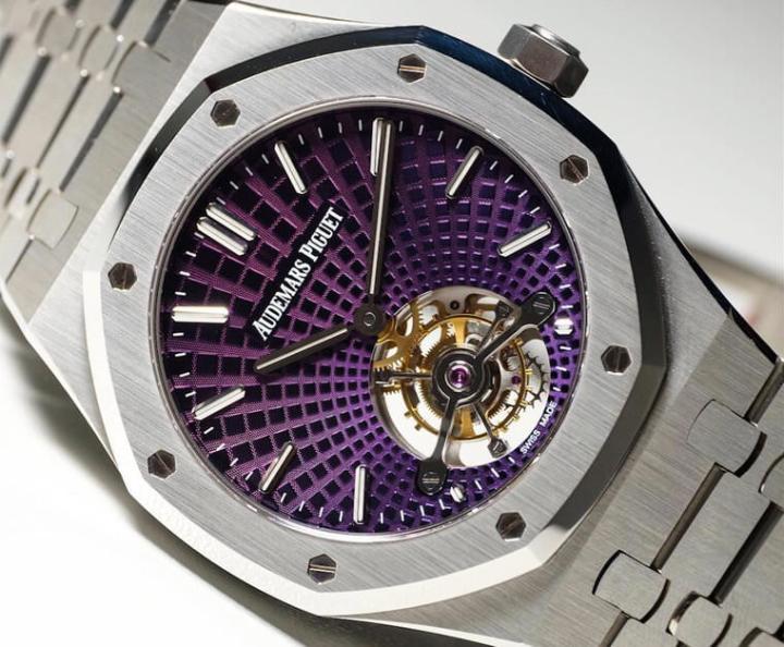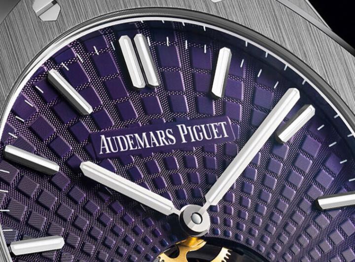 大概在2018年左右AP推出了新版的RO超薄陀飞轮,这批新款除了加入了若干新潮的配色和宝石镶嵌,更本质性的修改是它们将皇家橡树经典的格纹面盘由纵横垂直交错的方正样式改成了以6点钟陀飞轮为中心向外放射的构图。短短数年间新式的设计快速地普及到整条产品线,目前仍然采用传统方格纹路的在型录上只剩下一只金面玫瑰金款和另一只渐层灰面铂金款,而采用新面盘的款式中只有这次介绍的这款紫面是不锈钢表壳,蓝面的全是金壳或钛金属材质,过去以为再理所当然不过的基本组合如今已然不复见。