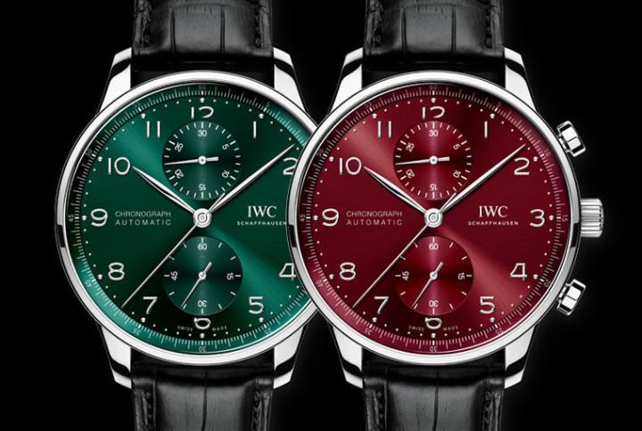 IWC万国表2020年发布三款全新葡萄牙系列计时表,系列加入两款新作,一款选用酒红色面盘,另一款则采用绿色面盘。此外,同时推出以18K红金表壳搭配蓝色面盘的「专卖店」特别版。