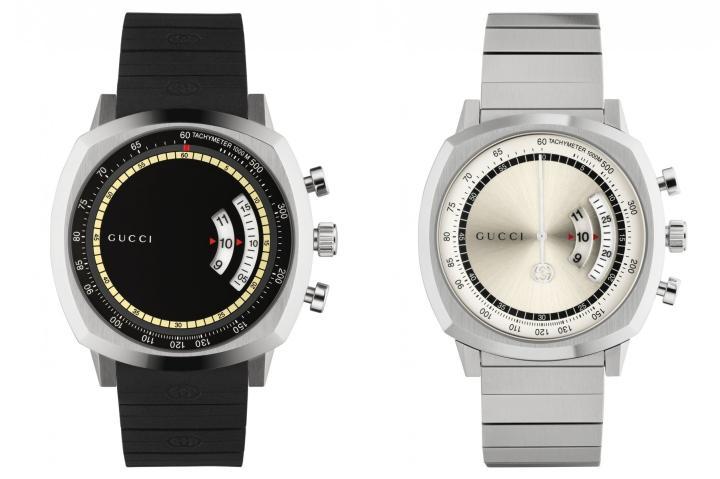 除米奇版腕表之外,Grip系列还带来更具实用性的计时码表Grip Chrono,可实现时长一分钟的计时,在外观上也较经典款式更具阳刚大气风范。Grip Chrono系列腕表均采用直径40毫米的表壳,表盘上设置两个窗口,分别显示小时和分钟。其中一款采用精钢材质的表壳和表链,由互扣式双G造型的指针担当计时功能,具备功能性的同时亦能凸显品牌特质;另一款则采用精钢表壳和黑色橡胶表带,表带上饰有双G图案,计时功能由环绕表盘周围运行的红点指针负责。