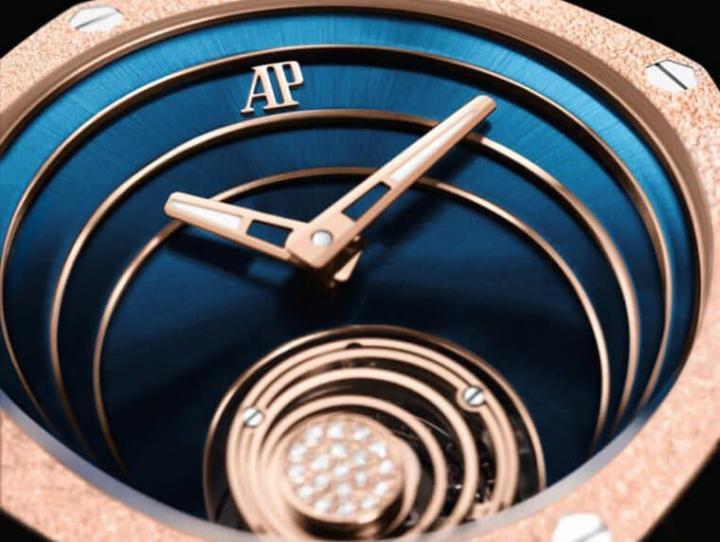 面盘是这款新表的主要亮点,功能性方面表款就是明确的二针加陀飞轮格局,只是有别于同等级手表,皇家橡树概念霜金飞行陀飞轮的顏值显然更高,因为爱彼是将蓝色太阳纹装饰面盘设计成一圈一圈的高低层次,就连陀飞轮框架也从平面进化到立体境界,以由外而内、从低到高的设计将陀飞轮塑造成一个漩涡中心般的存在,如此一来手表面盘上的蓝色不仅会随光线反射而有深浅变化,看起来也像是从陀飞轮所处的6点位置往外扩散出去的效果。光是这样还没说完,品牌又加码在陀飞轮轴心顶部的盖板镶上超过十颗钻石,当一只手表同时拥有霜金表壳、钻石镶饰和陀飞轮装置,可想而知它的视觉效果会有多迷人。
