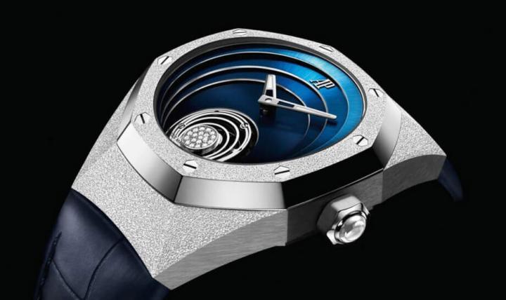 皇家橡树概念霜金飞行陀飞轮除了在贵金属表壳上另外以霜金工艺敲锤出纹理细腻的刻纹(远看还以为是表壳镶钻石发出的光芒),它的表冠还镶上半透明凸圆蓝宝石,展现比较华丽雍容的风格。