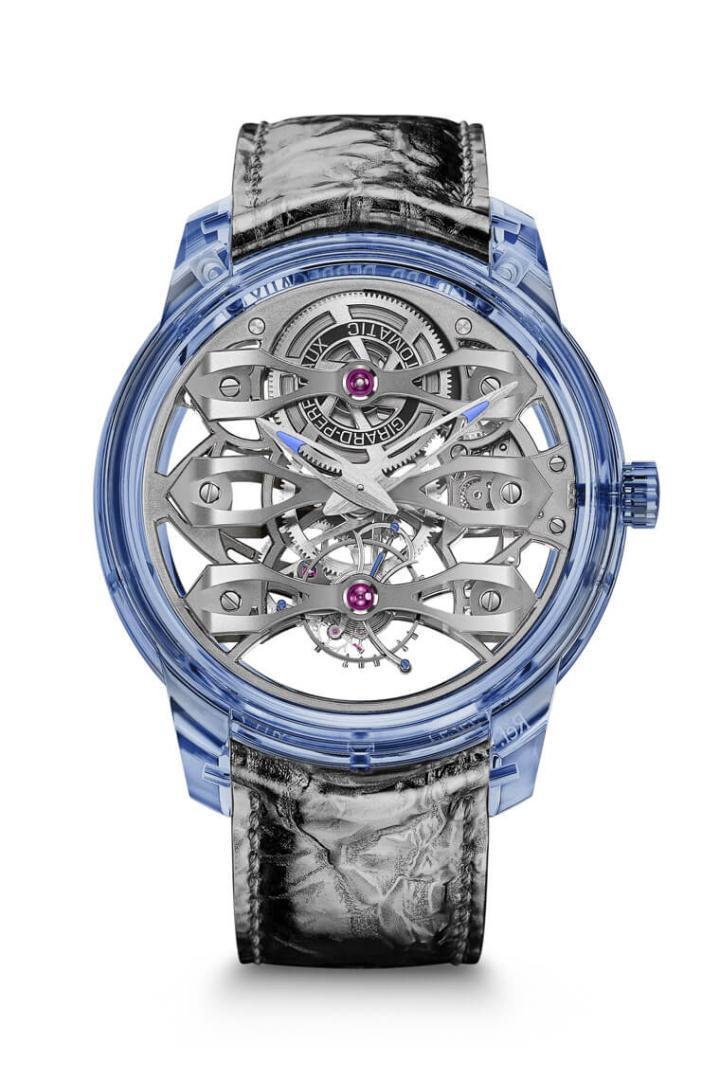 表款命名的灵感源自一种超亮天体Quasar(类星体),而其淡蓝色表壳是由一整片蓝宝石水晶玻璃加工制作而成。藉由通透的表壳及无色透明的Box式蓝宝石水晶镜面,可将品牌自制的GP09400-1035镂空机芯看得更为清楚彻底,而且又比一般无色的透明表壳多了些视觉吸引力。