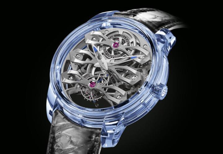 芝柏表继先前推出无色透明表壳手表后,新作Quasar Azure三金桥陀飞轮则是品牌首见带有蓝色调的透明表壳的创新研发成果