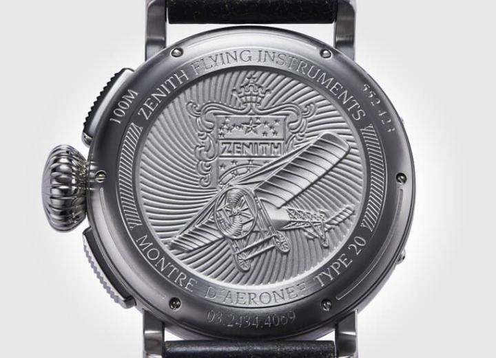 Pilot Type 20 Rescue搭载的Elite机芯(大三针)和El Primero机芯(计时码表)震频分别为28,800次/小时和36,000次/小时,动力储存则同样为50小时,而虽然它们都是飞行表,可是真力时也特地确保其防水性能可以达到100米的水准。手表底盖均刻印上了法国航空先驱Louis Blériot在1909年佩戴真力时手表飞越英吉利海峡时搭乘的飞机图案和真力时飞行仪器的徽章,低调彰显出品牌与飞行表之间的深厚渊源。