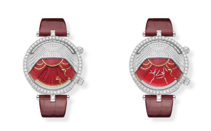 三款手表分别呼应芭蕾舞剧《珠宝》的章节,藉由声音及画面重现由舞衣和配乐交织而成的优美意境。随着面盘上的舞臺捲起帷幕,乐音悠扬响起,一场生动的芭雷舞码就在眼前上演。一旦佩戴者按下按把,转盘上有五位芭蕾舞伶身穿呼应不同宝石色泽的舞衣登场,踏出取材自美国芭蕾之父George Balanchine的经典舞步,音乐亦随即响起。梵克雅宝以钟琴及音乐盒的清脆音色,奏出分别由佛瑞、史特拉汶斯基及柴可夫斯基编写的三段旋律,两种乐器的搭配让手表的乐音听起来格外悦耳。