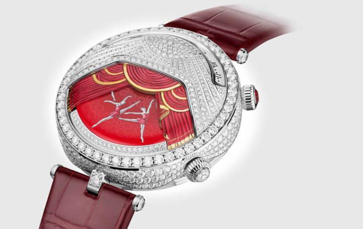 这系列手历经品牌十年构思,其所搭载的手上链机芯及芭蕾舞面盘模组更是历时七年才研发成功。当然手表的本质还是要用来显示时间,这款表由于大部分面积都用来诠释芭蕾舞的场景(以及钻石镶嵌装饰),因此手表的显示偏置于面盘12点方向,梵克雅宝以一枚星形指针在12小时刻度上进行逆跳显示,让人在欣赏美不胜收的《珠宝》芭蕾舞剧之际也不会忘记要注意时间。