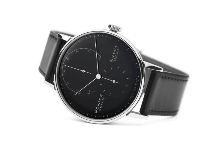 Lambda—175 Years Watchmaking Glashütte的珐琅面盘由于金质底座皆带有微微弧度,加上NOMOS又特别在珐琅材质表面施以加工处理,使得面盘看起来饶富视觉深度、色泽也更饱和光亮,先行建立赏心悦目的视觉美感。Lambda腕表在当年一推出就引人瞩目的关键之一在于它虽同样依循包浩斯风格但却蕴含更大胆前卫的设计。表款在面盘6点方向设有面积相对较大的「小秒盘」,不过更夸张的是位于12点方向、佔据面盘面积约有1/4以上且跨度达297度的超大动力储存显示,由于Lambda是一款手上链腕表,即使它长达84小时的动力储存空间优于一般手上链时计,但对佩戴者而言,能直接透过面盘上的动力储存显示了解腕表动力消长情况将更有助于其掌握上链时机。如此一来,包括时、分指针、小秒针与动力储存显示指针各自按照大小圆圈轨跡运行,使得风格简洁的面盘实际上富有特别的动态美感,由此再度体现出NOMOS备受设计大奖推崇的美学涵养。