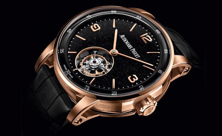 玫瑰金款是品牌首度开创出黑色砂金石珐琅面盘的先锋作品,搭配18K玫瑰金阿拉伯数字与线型时标、指针以呼应表壳材质,至于6点位置的陀飞轮还是一大视觉亮点,飞行陀飞轮由于少了顶层桥板的遮蔽,因此佩戴者在观赏陀飞轮运转的过程中可以更清楚、看得更过癮。至于品牌这次新尝试也打破了我们过往对于砂金石面盘的印象,因为以前如果採用正片砂金石作为面盘,那麼其注定只能呈现矿石本身的蓝色调,但是改用新款这种珐琅+砂金石碎片的方式,就能让手表一方面保有砂金石特有的星空联想效果,同时还多了一些色彩变化的弹性,看起来相当有特色。