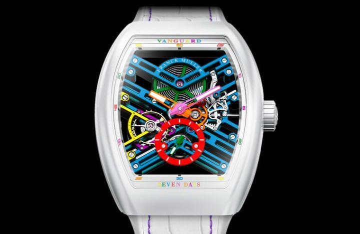 这几年「彩虹」成为想要一种与夯表相关的重要关键字,因为前几年劳力士Daytona 116595RBOW开始带起了一股让人眼睛吃冰淇淋的彩色旋风,由于116595RBOW引起许多名人望族争相收藏,导致市面上也出现愈来愈多具有类似彩色宝石表圈的作品,发展到2020年这种彩虹风潮方向未艾,不管是连表壳镶满彩宝的款式,或是仅用彩色时标来达到炫目效果的设计,又或者是像宝齐莱Patravi TravelTec这种单色但一次出很多种顏色的彩色表,都算是彩虹风潮的一员;而最近制表向来以大胆闻名的FRANCK MULLER也提出了自己的彩虹新观点,透过品牌新作Vanguard 7 Days Power Reserve Skeleton诠释属于FM的花花世界。