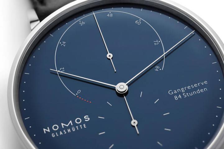Lambda—175 Years Watchmaking Glashütte的珐琅面盘由于金质底座皆带有微微弧度,加上NOMOS又特别在珐琅材质表面施以加工处理,使得面盘看起来饶富视觉深度、色泽也更饱和光亮,先行建立赏心悦目的视觉美感。Lambda腕表在当年一推出就引人瞩目的关键之一在于它虽同样依循包浩斯风格但却蕴含更大胆前卫的设计。表款在面盘6点方向设有面积相对较大的「小秒盘」,不过更夸张的是位于12点方向、佔据面盘面积约有1/4以上且跨度达297度的超大动力储存显示,由于Lambda是一款手上链腕表,即使它长达84小时的动力储存空间优于一般手上链时计,但对佩戴者而言,能直接透过面盘上的动力储存显示了解腕表动力消长情况将更有助于其掌握上链时机。如此一来,包括时、分指针、小秒针与动力储存显示指针各自按照大小圆圈轨跡运行,使得风格简洁的面盘实际上富有特别的动态美感,由此再度体现出NOMOS备受设计大奖推崇的美学涵养。