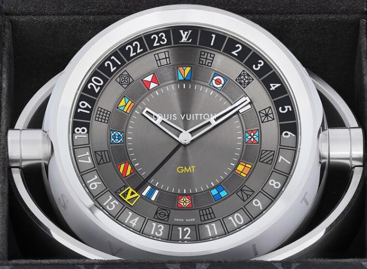 原来里面乘载了一款全新的LV桌钟,外观跟品牌先前推出的Tambour Moon Dual Time有点似曾相识,面盘外围有24小时刻度,内圈则有延续Escale Time Zone的那种国旗式花纹图案作为装饰。桌钟的显时功能主要就是中轴的时、分镂空指针加上与它们同轴的一枚GMT指针用以指示第二地时间,GMT指针造型迥异于时、分指针,它是一根细长的黑针,针尖则是放了一个镂空的黄色”V”字造型框,GMT指针搭配面盘外围的24小时刻度就能用来分别第二地时间。