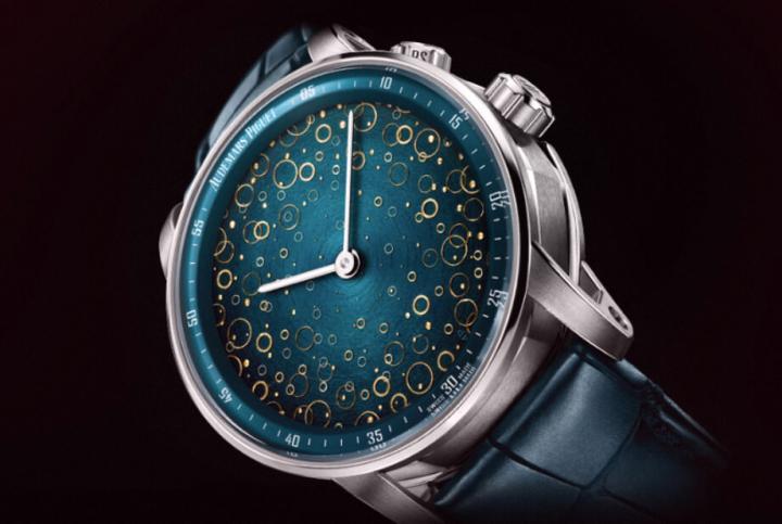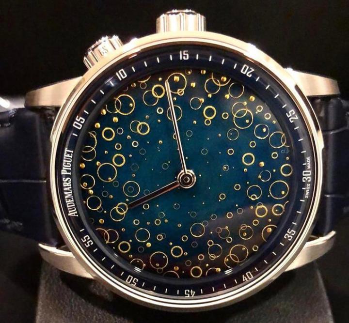 仅仅限量5只的CODE 11.59大自鸣钟乐超问表外观看起来简约,但是目前已经曝光的3款每款设计都有各别变化,重点是它们都是出自表坛超级有名的珐瑯大师Anita Porchet之手,Anita本次替AP这款年度代表作应用大明火金片珐瑯工艺来进行创作,以蓝绿色珐瑯为基底的面盘出现来不同形式的金片作为点缀,例如圆点或是纵横交错的线条等等。让手表看起来赏心悦目,也无形中提升了它的收藏价值以及艺术美感。