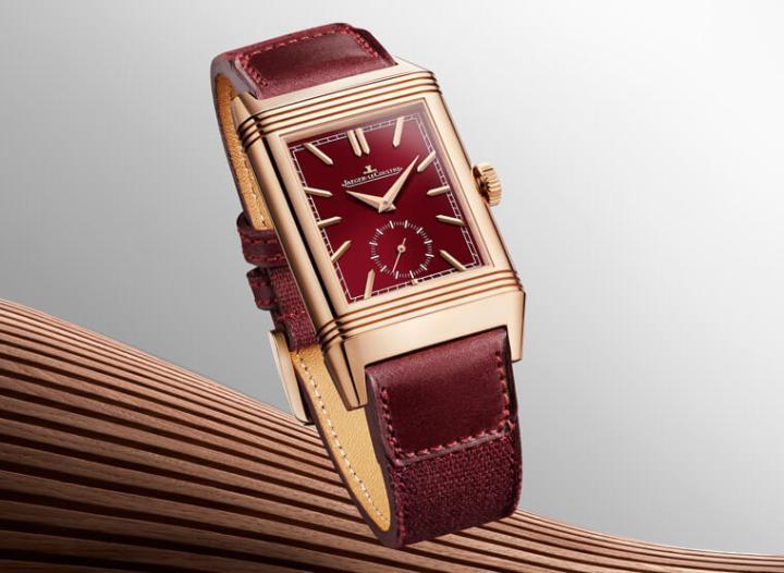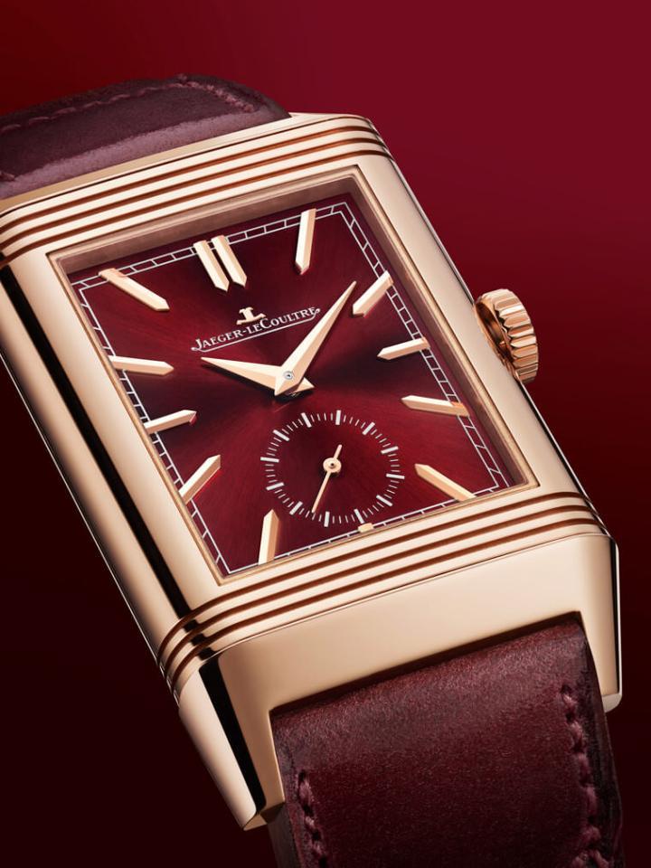 而在双面面盘方面,正面主要是采用酒红色漆面搭配玫瑰金展现一种温润优雅的气质,面盘外围有矩形的轨道式刻度,同时6点方向则有小秒盘,立体的刻面时标镶在面盘上,与太子妃式指针双双强化了面盘的立体层次。至于翻到背面面盘时,那又是一幕截然不同的画面了。背面面盘并没有像正面般具有显眼的酒红色,而是采用乳白色,不过积家在两个小表盘外围施加了巴黎铆钉装饰,小表盘本身也带有类似颗粒状的效果,同时其也有轨道式刻度搭配立体刻面时标;背面面盘除了有时、分显示,6点方向的小表盘则是带有24小时刻度的昼夜显示,积家更贴心地在右下角和左下角放上”DAY”和”NIGHT”字样,这样一来在判读昼夜时就能一目了然。
