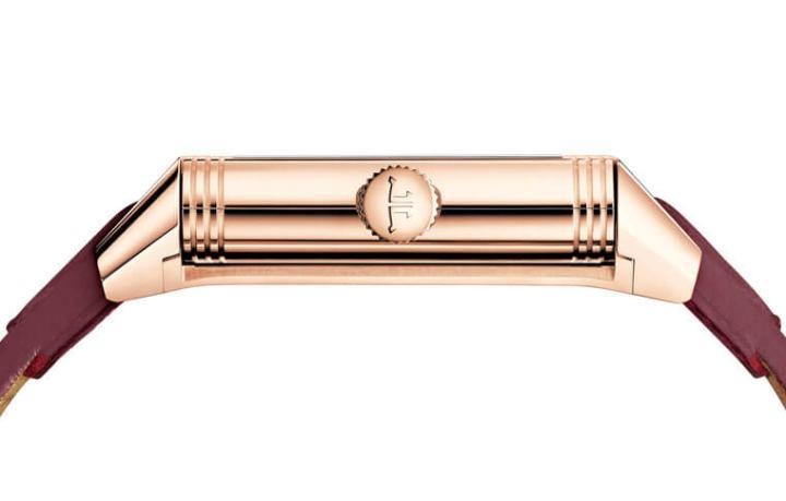 新款采用玫瑰金材质打造它长度达47mm的表壳,Reverso发展至今,外观的设计并没有翻天覆地式的修改,就以目前我们看到手表的造型来说,例如短尖型表耳、表壳上下方的两道水平刻纹等等。表款光看外部会只注意到它设有一枚表冠,但问题来了,如果想要调校背面的第二时间面盘,又该怎么操作呢?原来两地时间的调校是应用隐藏在表框顶部的一枚推杆来调校,所以如果佩戴者没有翻开表壳,光从手表外观是看不到这枚调校推杆的。