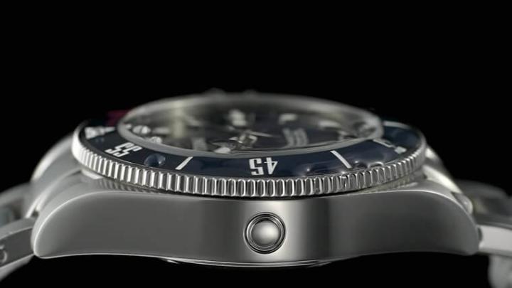 现代重生的Seascoper 600米深潜系列手表採用不锈钢材质制作42mm的表壳,表冠两侧有护肩装置加以保护,至于单向旋转表圈还是以高精密陶瓷打造,既耐刮又不会褪色,可以让手表戴久了也不会有掉漆的感觉。Seascoper600米深潜系列首发便有不锈钢/金色PVD表壳搭黑面、不锈钢表壳搭黑面以及不锈钢表壳搭蓝面等三种选择。其中双色款的表圈刻度和指针与时标等细节呼应整体造型而使用金色,不锈钢黑面款的表圈刻度则是朴实的白色,至于不锈钢蓝面款表圈就比较有意思一点,或许是为了要突显蓝面与黑面的个性,因此蓝面款的表圈前15分钟刻度刻意填上红色以与其他的白色刻度区隔。
