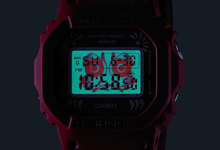 其中DW-5600DA的面盘周围彷如达摩脸庞的延伸,包括眉毛与身上的线条都出现在面盘周围,至于达摩脸部的眼睛、胡须等细节则是在佩戴者开启手表背光照明时会浮现在面盘上。而DW-6900DA由于具有三眼数位小表盘设计,因此G-SHOCK直接将三眼小表盘比拟为达摩的眼睛与鼻子等感官,所以这款表的面盘周围乃是白色,象征达摩的脸庞,而当手表开启背光照明时,下方的液晶显示萤幕会出现结合”G”字与胡须的创意图案,与DW-5600DA同样构成具有面盘延伸画面的作用。