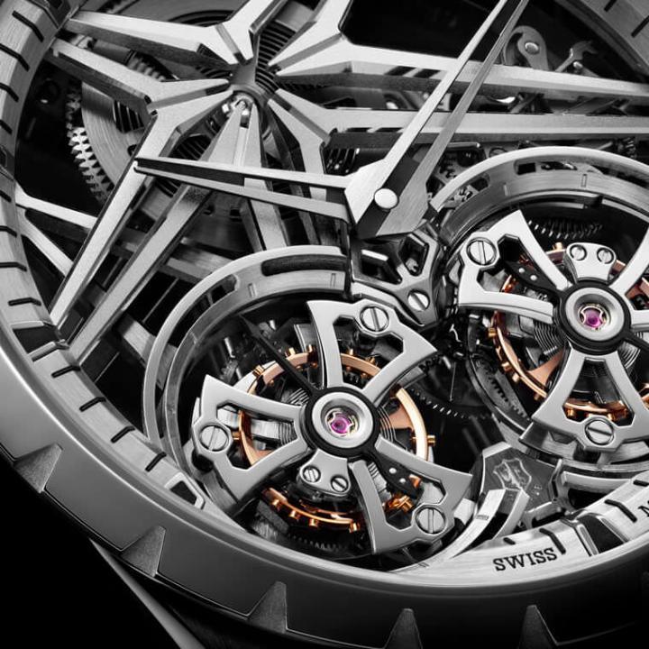 两组陀飞轮均配备清亮的钛金属下层框架以及经过镜面抛光的钴铬合金上层框架,罗杰杜彼运用精致的凹槽饰纹,呈现出全新的边缘处理风格——同样的打磨亦可见于星形桥板装饰、面盘边缘、时针轮轴、表圈及表冠等其他零件上。