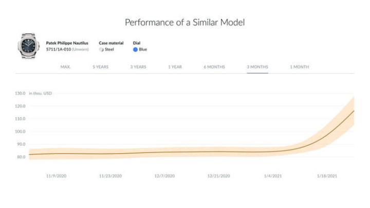 根据知名二手表网站Chrono24的资料,2020年通常收藏家成交一只5711/1A的价格落在美金72,600左右,这已经高出原厂定价的一倍以上;但迈入2021年后,当市场上一开始出现5711/1A即将停产的传闻时,在Chrono24网站上这款表的价格立刻被炒高了25%左右,然后当前几天PP确认停产的消息一出,5711/1A的价格又涨更凶来到31%!结果通算下来,2021年第一个月还没结束,5711/1A的价格整体来说就比2020年高出49%。
