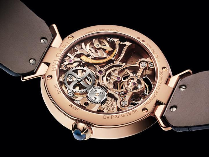 玫瑰金材质/BVL 308 Dischi自动上链机芯/时、分、显示/孔雀羽毛镶嵌面盘/表款镶钻440颗,约重3.78克拉、蓝宝石25颗,约重0.98克拉/蓝宝石水晶镜面、透明底盖/防水30米/表径37mm/限量50只/参考价:470,000 RMB