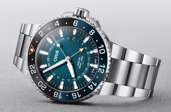 然而ORIS为了突显出鲸鲨主题,特别以鲸鲨纹路为灵感,创作出手表面盘上一颗颗大小不一的圆形刻印纹路,同时其也带有渐层色彩效果,呼应表圈的双色陶瓷圈,形成令人耳目一新的视觉印象。