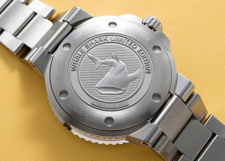 翻到表背,实底盖上延续面盘的特殊纹路而来,ORIS特地在底盖中央刻上鲸鲨招牌的阔嘴轮廓图案,而且鲸鲨身上的颗粒纹路也再次让人想起面盘花纹,此外鲸鲨图案周遭亦加上水波纹路,塑造出鲸鲨在水中悠游的画面;手表的限量编号就刻在鲸鲨阔嘴的下缘,提醒佩戴者手上的表都是相对稀有的产品,值得好好爱护收藏的同时,也透过手表鲜明的设计主题让人们更愿意去了解这种濒临绝种生物目前遇到的困境。
