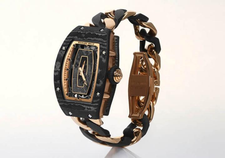 另一款RM 07-01自动上链表特别之处反而不在表壳,而是表带,RICHARD MILLE先以Carbon TPT®碳纤维制成表圈与底盖,再与合5N红金中层表壳合体建构出手表外观主体,而从表壳向上下延伸的表带则是做成锁链式的形状;令人感到惊艳的是,品牌乃是以手工打磨的方式将Carbon TPT®碳纤维和5N红金链环彼此交织,让链带既像高雅配件,同时也带有与表壳呼应的科技感,且还能服贴于手腕塑造优异的佩戴体验。
