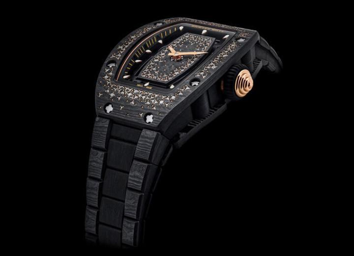 此次RICHARD MILLE采用Carbon TPT®碳纤维材质作为两款表表壳的主材质,它的黑色表面具有高辨识度的大马士革钢纹理并带点不规则的波纹,看起来既独特,戴起来则是又坚固又能顾及轻盈的佩戴舒适性,对于女性而言是相当友善的材质。