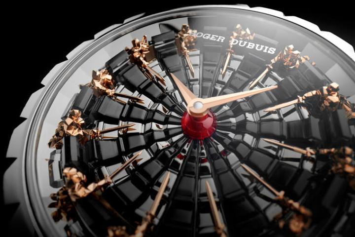 让人陶醉的不只有表壳,手表的面盘也是充满可看性,为了诠释圆桌骑士这个主题,罗杰杜彼再次采用立体化设计面盘,看起来呈同心圆放射状的面盘结合深灰色珐瑯、白金和慕拉诺玻璃(Murano Glass)等材质,其中慕拉诺玻璃用来制作面盘轴心的红色拱形,藉以象征圆桌这个中心点。而在面盘外围还分别矗立著12尊精致的玫瑰金骑士金雕,它们高度仅7mm,体积相当细小,不过罗杰杜彼仍能在这么小的体积上以手工加以雕琢、镌刻和精修,这点若靠近细赏面盘更能体会,每尊骑士金雕不只做为装饰,同时也兼具时标的辅助显时效果。