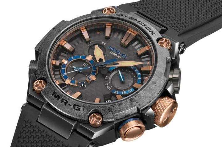 MRG-B2000B以钛金属打造表壳与表带,金属表面经深层硬化与DLC类钻碳处理。而MRG-B2000R则以钛金属表壳搭配氟橡胶表带,表带另外使用在日本象征力量的毘沙门天盔甲之独特龟壳图案装饰,手表表圈可见品牌运用结晶钛金属制成,钛材质经高过温加工后会在表面形成独特的水晶图案,这道工序让人想起制作日本刀刃时的“沸”。