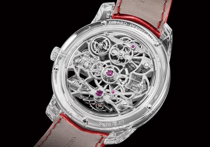 蓝宝石水晶材质/GP09400-1439自动上链机芯/时、分显示/陀飞轮装置/蓝宝石水晶镜面、透明底盖/防水30米/表径46mm/限量1只/参考价:2,000,000 RMB