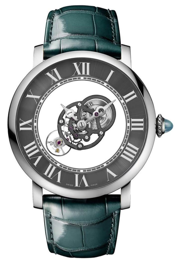 而Rotonde de Cartier Astrotourbillon则因陀飞轮会在表上公转一圈,在视觉上令框架每分钟环绕面盘运行一周,变相成为手表的秒针。陀飞轮的平衡摆轮与擒纵轮并不是设置在框架旋转轴之上,而是设置在框架的一侧,与其旋转轴心连成一线,不像传统的陀飞轮那样直接嵌到机芯上。这款属于卡地亚较后期推出的镂空版本,机芯桥板在面盘12点与6点方向被镂穿成罗马数字,用以代替时标。卡地亚于表冠镶嵌砂金石,并搭配深蓝色鳄鱼皮表带。