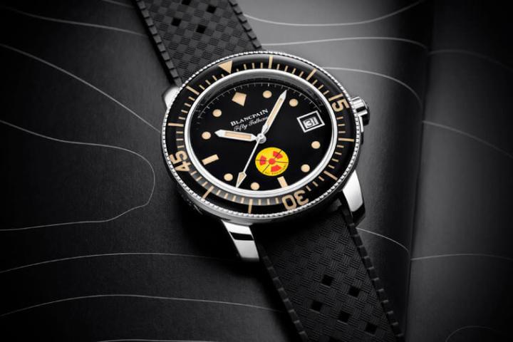 五十㖊自从1953年开发登场以后受到不少国家军队的青睐,1960年代中期各国军队所购买的五十㖊是为Fifty Fathoms RPG 1这个版本(今日则是暱称为BUND No Rad),此时的五十㖊就是宝珀开始在手表上印上无辐射标志的源头,也因此到了近代品牌常常回溯这段历史,借由推出复刻作品之际,重现这个半世纪前颇具重要性的标志。虽说表坛现今早已克服夜光涂料的辐射问题,不过无辐射标志依旧有其不可抹灭的历史意义,点缀在现代新款上则是有助于提升手表的话题性与吸引力。