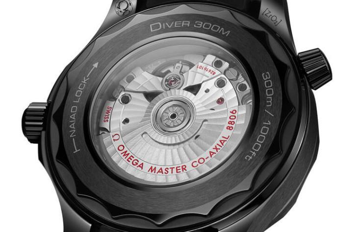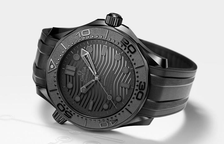 海马潜水300米Black Black手表以黑色陶瓷制作表壳,包括它的表冠与排氦阀与底盖边缘等处的零件也都是黑色陶瓷,而且手表的陶瓷圈这次一改过去的抛光处理,反而少见采用磨砂处理。此外欧米茄也采用阳刻方式塑造出表圈的刻度,搭配上黑色橡胶表带(表扣也是黑色陶瓷),先一步替手表营造出黑得彻底的外型印象。